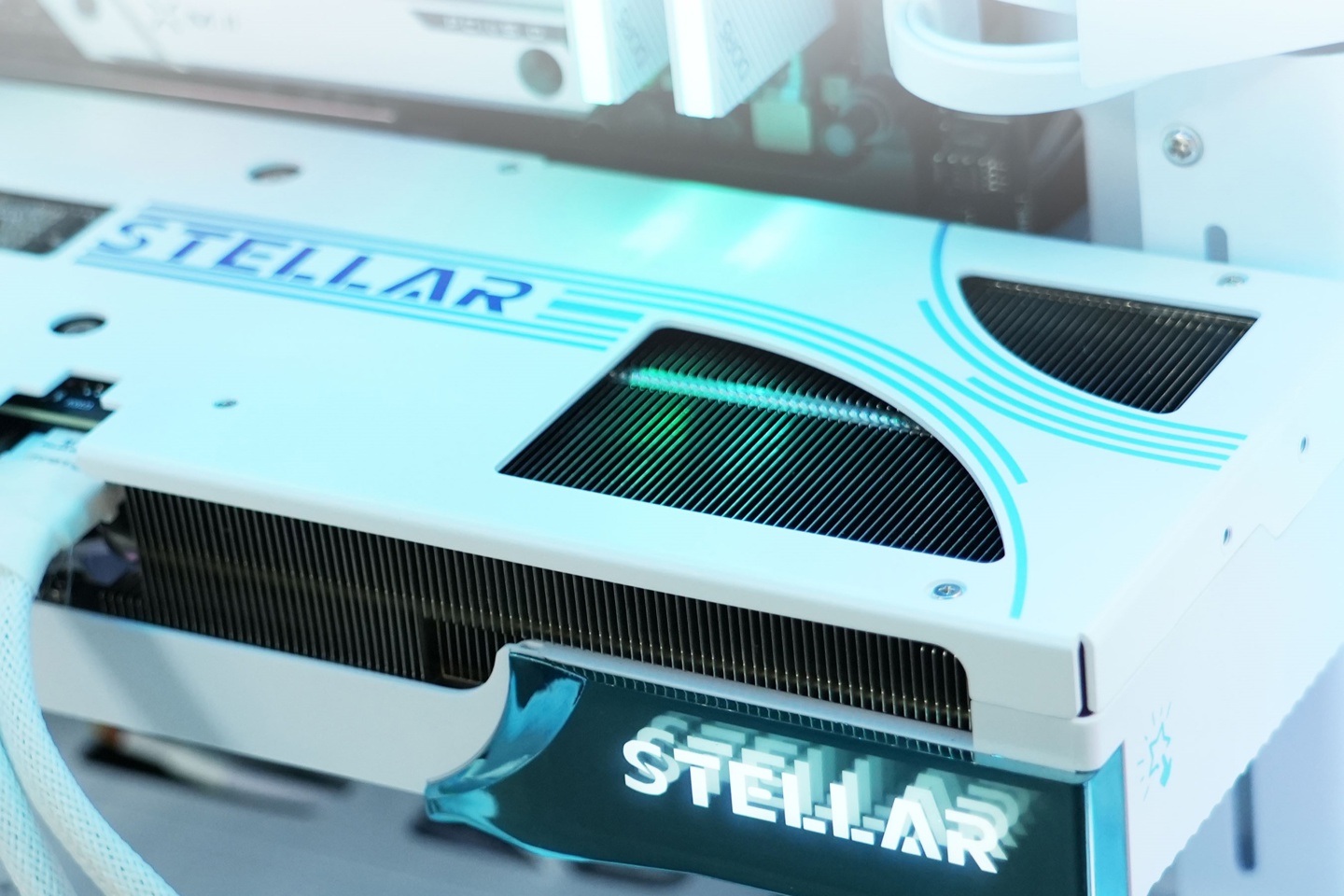 目前 RTX 4070 SUPER OC 12GB 星际已上线万丽官网,该显卡整体采用白底配以孔雀蓝的“星轨琉光”撞色面盖,侧面配备“STELLAR”字样镜面呼吸灯效。