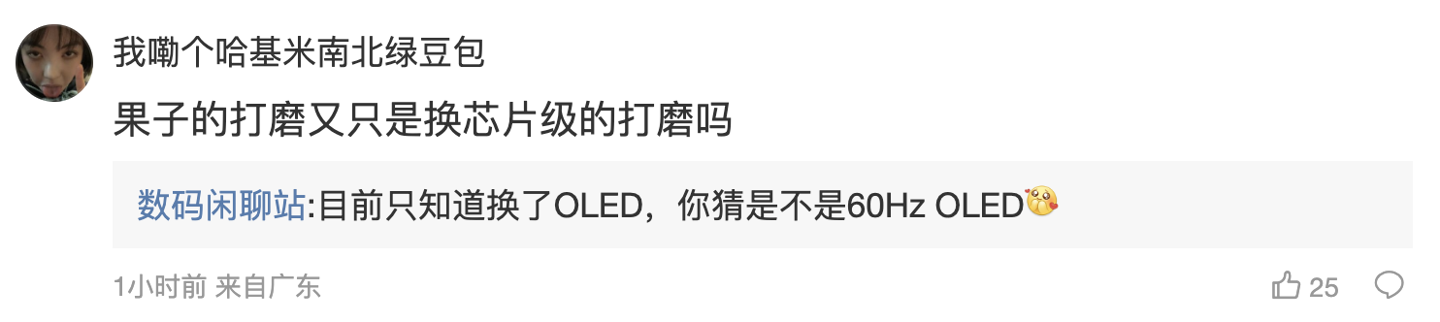后续有用户在评论区询问:“果子的打磨又只是换芯片级的打磨吗”,博主回复道:“目前只知道换了 OLED,你猜是不是 60Hz OLED”;另一名用户则询问道:“能不能爆料一下 O 加的 7.9 寸的产品”,博主则回复道:“没听说过,只知道 8.8 小平板,没开 7.9 英寸的手机 or 平板”。