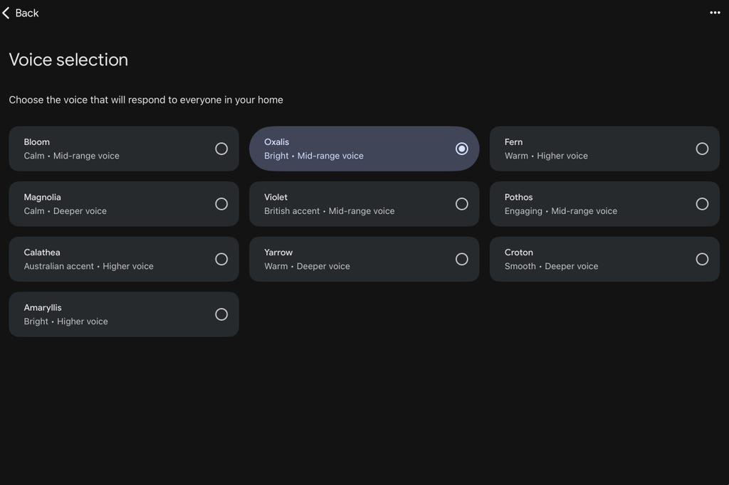 额外提示:使用Gemini for Home时,你可以尝试为语音助手更换声音,它提供了比以往更多的声音选项。我目前选用的是Oxalis,它的声音听起来像一位知识渊博的黑人阿姨,但你有很多声音和口音可供选择和尝试。