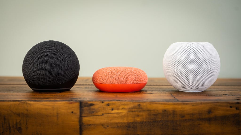 从左到右:Amazon Echo Dot(2020)、Nest Mini、HomePod Mini智能音箱选项。Chris Monroe/CNET