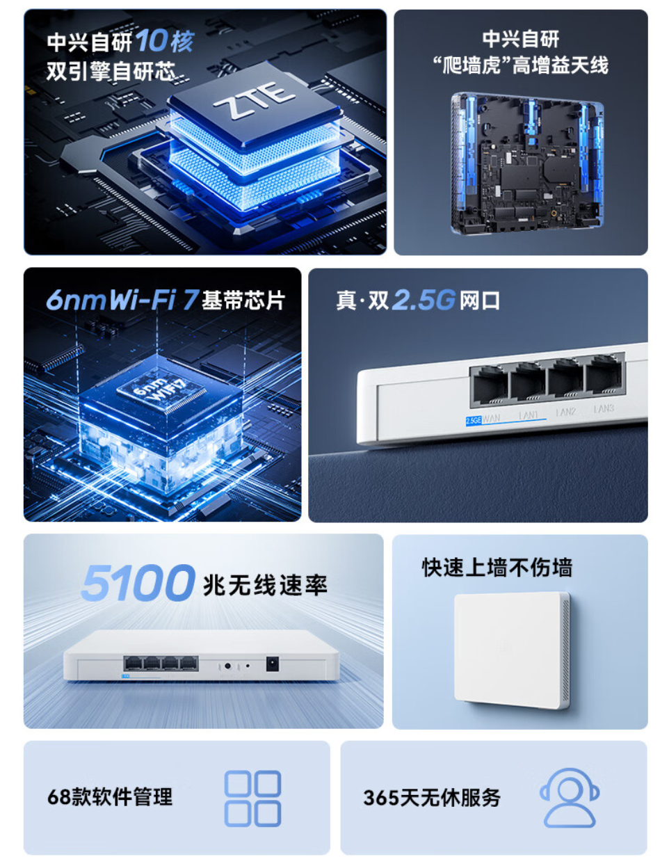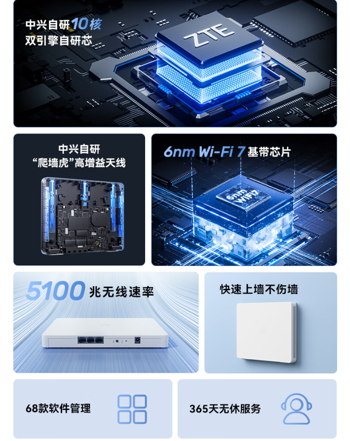 中兴晴天 BE5100 墙面路由器采用自研 10 核双引擎芯片 + 6nm Wi-Fi 7 基带芯片,辅以“爬墙虎”高增益天线,支持 5100 兆无线速率。