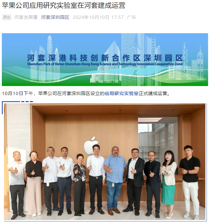 IT之家 10 月 10 日消息,河套深港科技创新合作区深圳园区发展署宣布,苹果公司在河套深圳园区设立的应用研究实验室今日下午正式建成运营,研究方向为 iPhone、iPad、Apple Vision Pro 等产品可靠性、质量和材料分析测试。