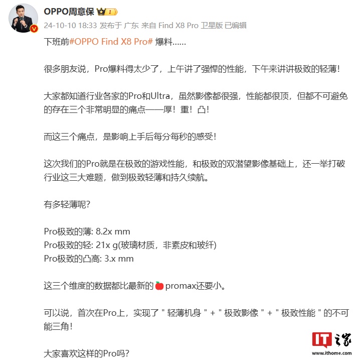 OPPO Find 系列产品负责人周意保今日在微博公布了 Find X8 Pro 手机的机身三个维度数据,IT之家附信息如下: