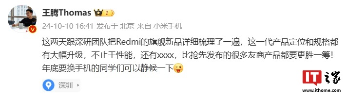 另外,小米中国区市场部副总经理、Redmi 品牌总经理王腾今日发文透露,Redmi 旗舰新品(预计为 K80 系列)整体产品力有所提升,除性能外还将有其他隐藏亮点(暂未公布),其发布时间预计为年底。