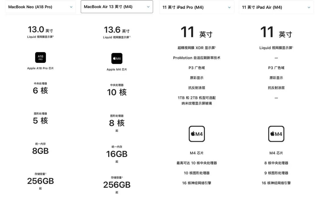 但现在,MacBook Neo 彻底放下了身段,它的起售价甚至比 iPad Air M4 单机还要便宜。
