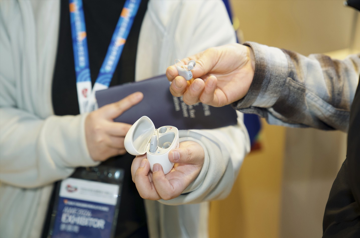 而在AWE2026现场,适老化产品开始更加贴近日常。东方枢纽展区的一角,人流不算密集,和周围的机器人展台相比,这里安静许多。一款形似蓝牙耳机的小型设备,摆放在展台的显眼位置。工作人员递给观众试戴,并介绍说:“这是一款助听器。”