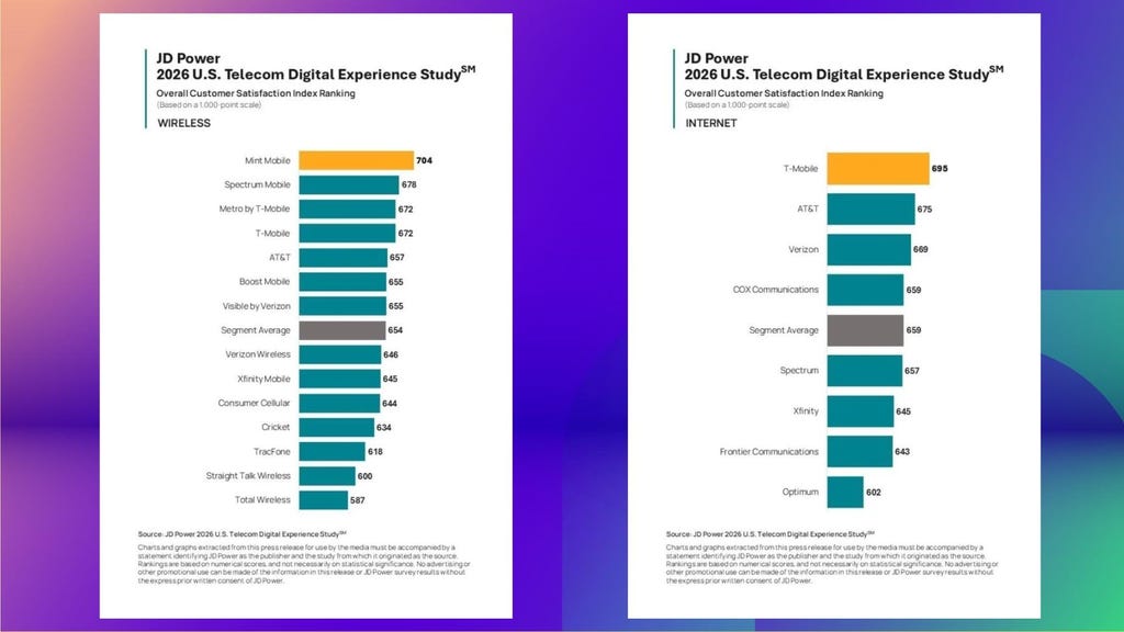 在互联网服务提供商中,T-Mobile在调查中得分最高,为695分,其次是AT&T(675分)和Verizon(669分)。