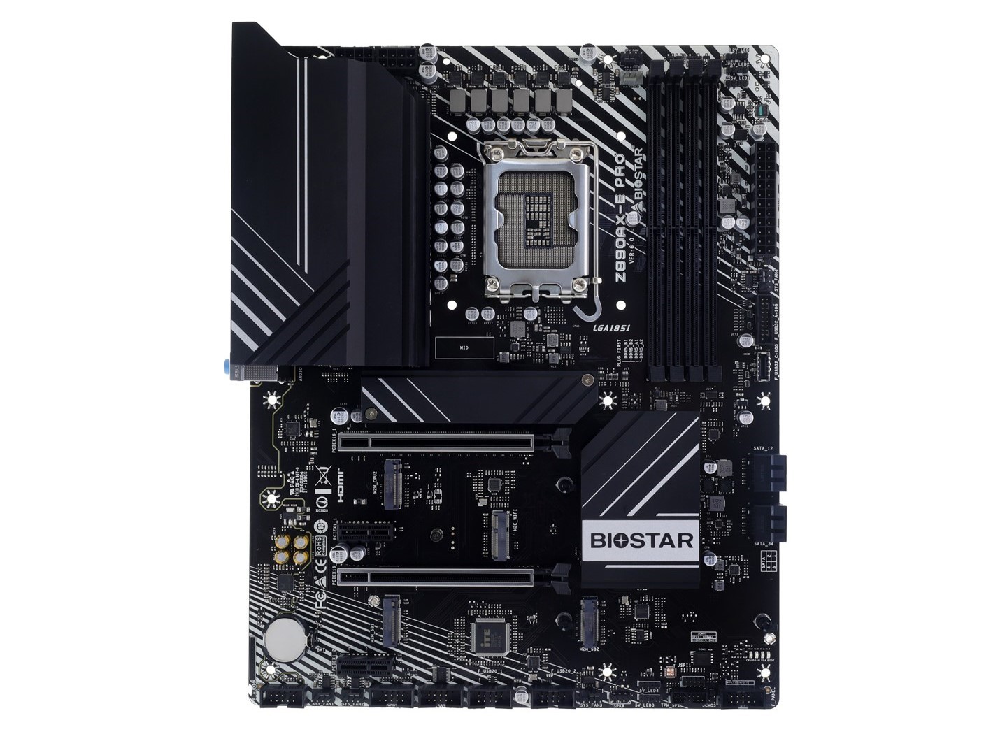 存储方面,Z890AX-E PRO 共拥有 4 个 M.2 2280 盘位和 4 个 SATA III 接口,其中包含一个来自 CPU 的 PCIe 5.0×4、一个来自 CPU 的 PCIe 4.0×4、两个来自芯片组的 PCIe 4.0×4。