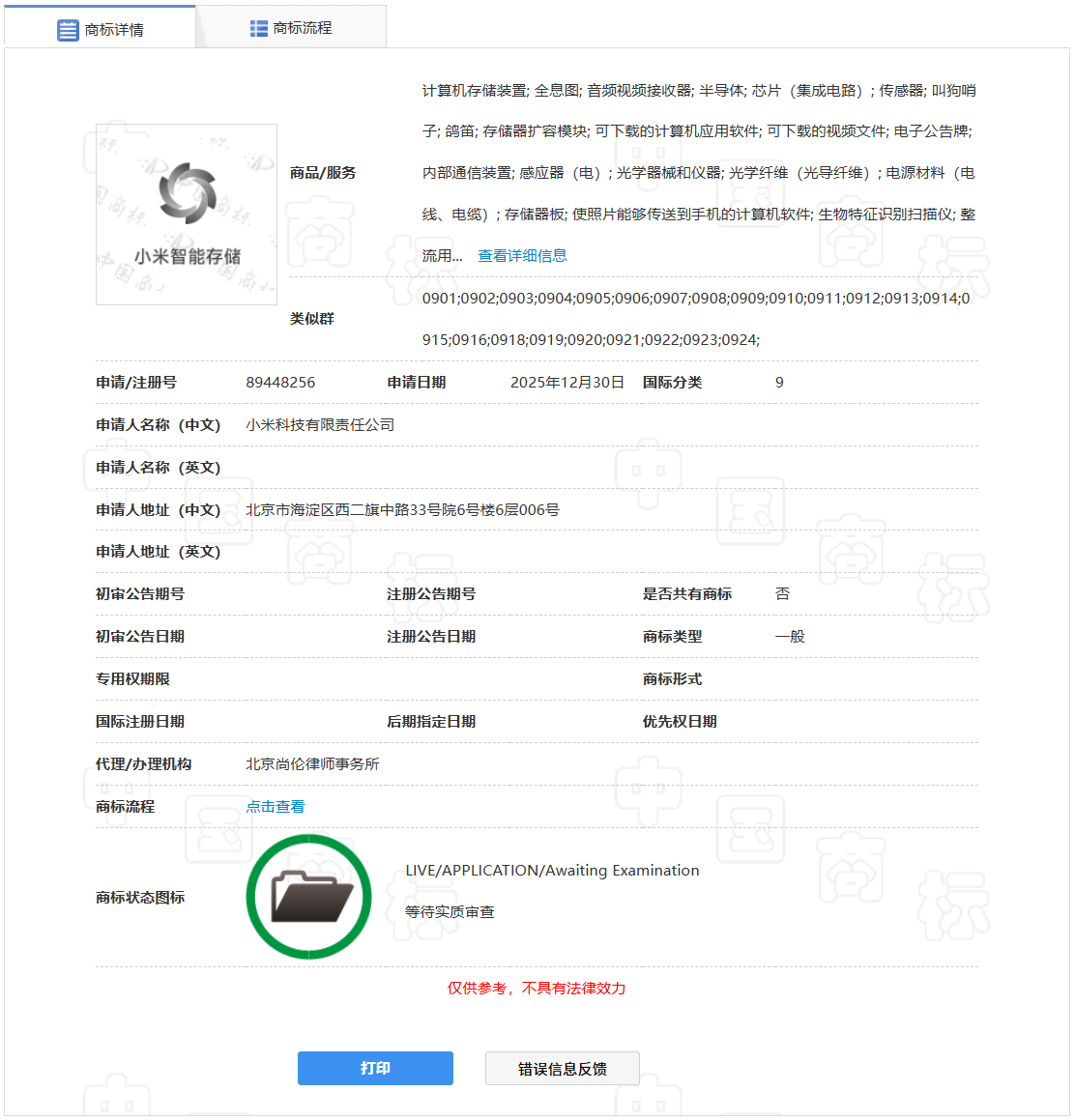 此外,小米还申请注册了“小米智能存储”商标,归属于国际分类第 9 类,涵盖的商品 / 服务范围包括:计算机存储装置、半导体、芯片(集成电路)、存储器扩容模块、存储器板、使照片能够传送到手机的计算机软件、固态硬盘、电子存储器等。