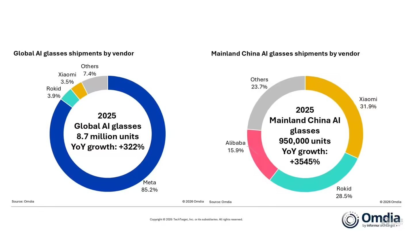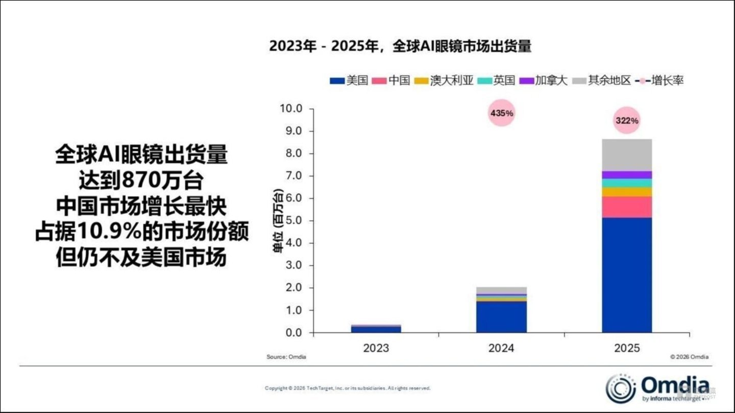 Omdia最新发布的数据显示,2025年,全球AI眼镜出货量达到870万台,同比大幅增长322%。其中,中国大陆市场占全球AI眼镜市场10.9%的份额,出货量接近100万台,成为仅次于美国的全球第二大市场。