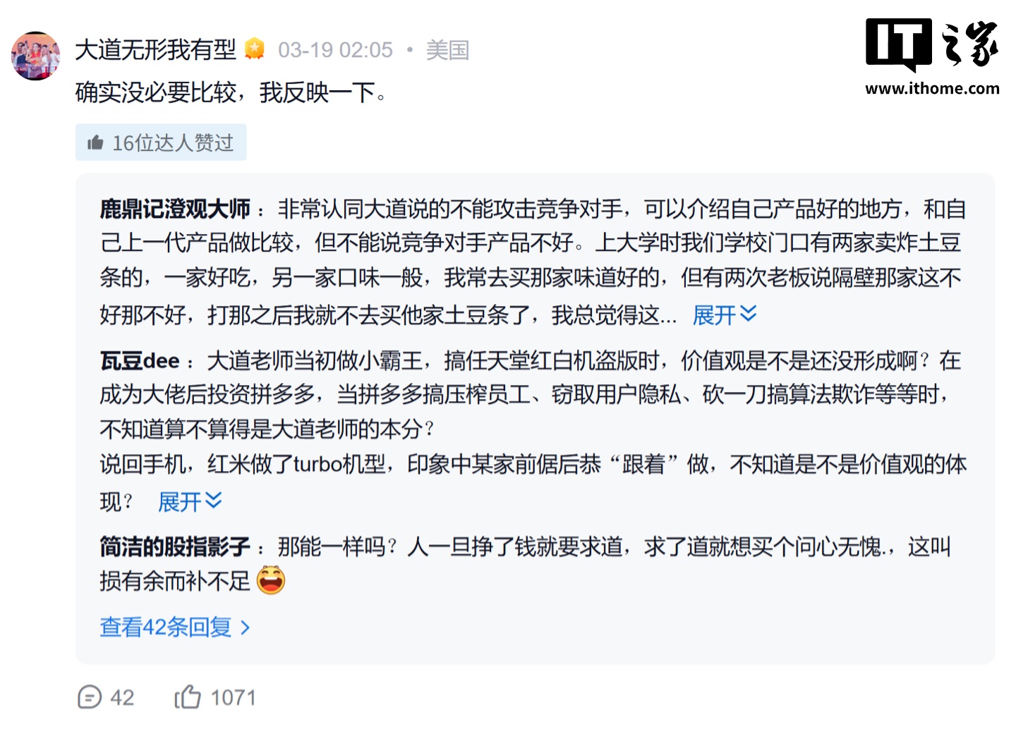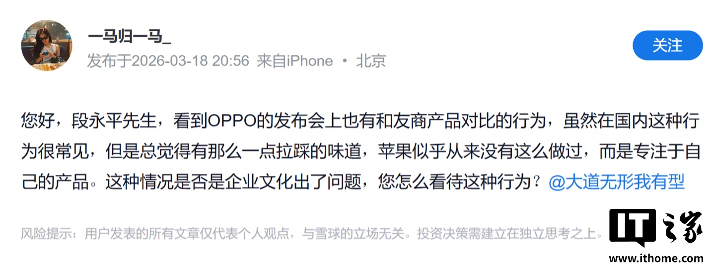 IT之家 3 月 21 日消息,知名投资人、步步高电子创始人段永平前天在雪球平台(IT之家注:网名 @大道无形我有型)发文,回应“OPPO 发布会对比友商”事件。
