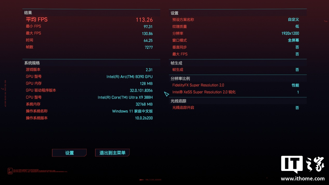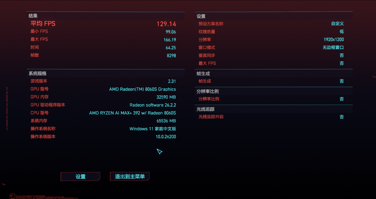最后是《赛博朋克:2077》,这款游戏对性能要求的压力也是很大的,并且对 GPU 技术拥抱很积极,在 1200P 分辨率 + 低画质预设 + DX12 模式下,华硕天选 Air 2026 运行游戏自带基准测试,游戏平均帧数能有 129 帧,这个帧率表现已经是十分出色了。