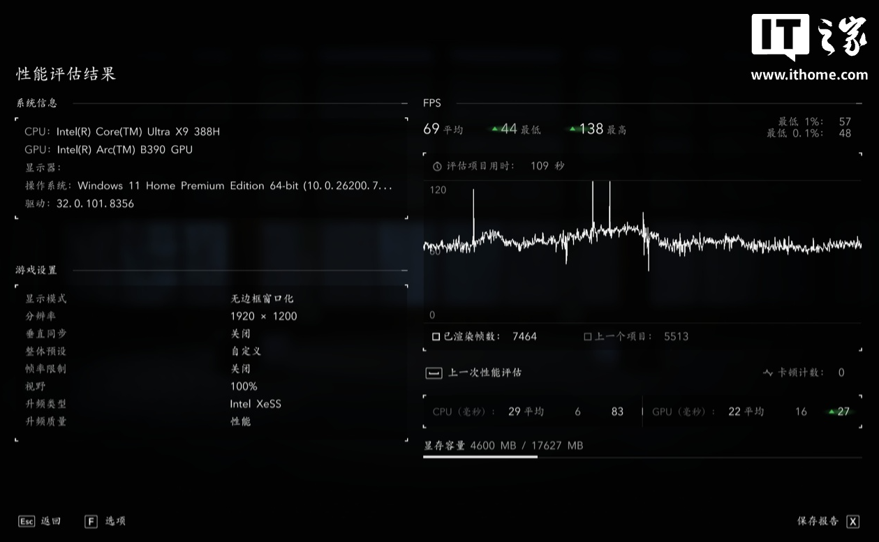 再看联想小新 Pro GT 16 AI 元启版,酷睿 Ultra X9 处理器 388H 得分为 6294 分,显卡测试成绩为 46.63 FPS,表现几乎只是华硕天选 Air 2026 的一半。