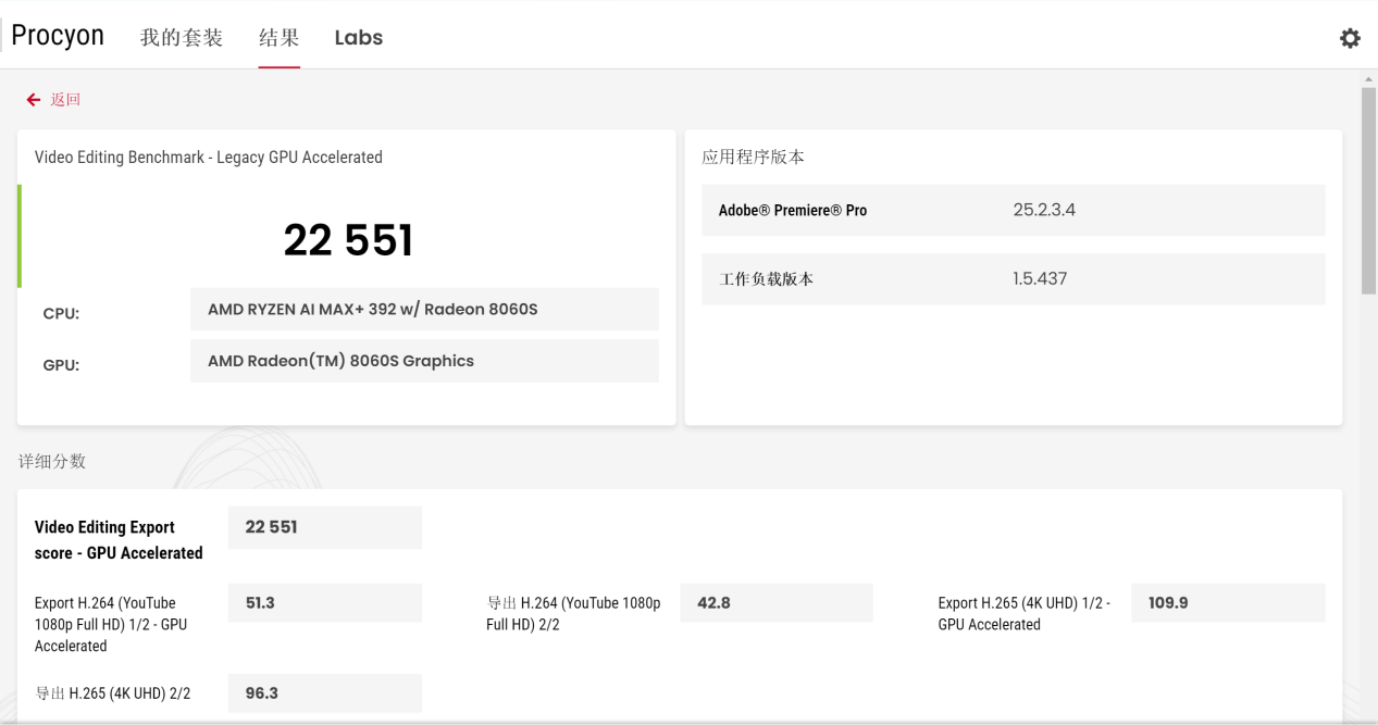 在 UL Procyon 的视频编辑基准测试中,华硕天选 Air 2026 搭载的锐龙 AI MAX+ 392 处理器拿下了 22551 分。