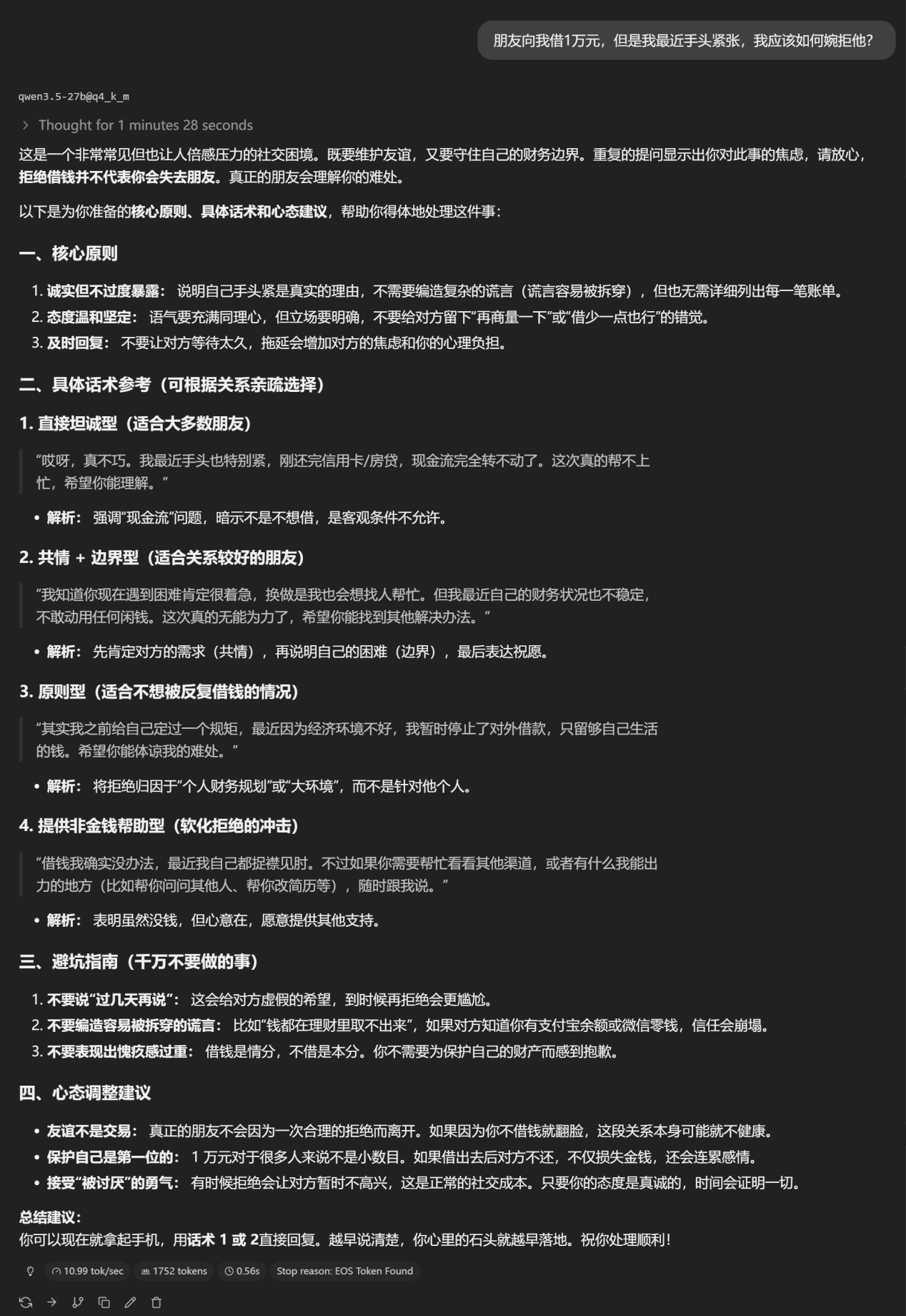 这一次,在婉拒借钱的朋友的问题中,性能表现反而比之前 27B 参数的模型要好,输出 2132 个 tokens,生成速度达到了 50.81 tok/s。