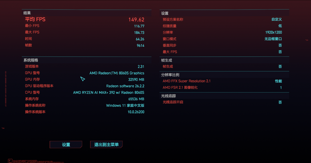 在进一步开启 FSR 超采样性能档选项后,华硕天选 Air 2026 游戏平均帧数提升至 149 帧。
