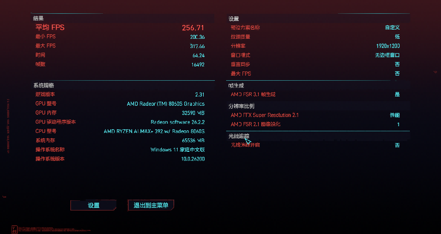 通过以上几款游戏的简单测试,可以看到锐龙 AI Max+ 392 处理器的游戏性能表现确实是非常强大的,超大的 CPU 缓存和对高频内存的支持让其在相对低分辨率下能够保证游戏拥有畅玩的帧数下限,而保留了满血 Radeon 8060S 集显则让锐龙 AI Max+ 392 处理器的游戏性能上限也很高,特别是在 FSR 超分和帧生成技术的加持下,锐龙 AI Max+ 392 处理器即便面对当下的 3A 大作也能在可以正常游玩的 1200P 分辨率低画质预设下达到 200 帧以上的水平,这对于华硕天选 Air 2026 这样的轻薄本来说,实在是游戏爱好者的福音了。