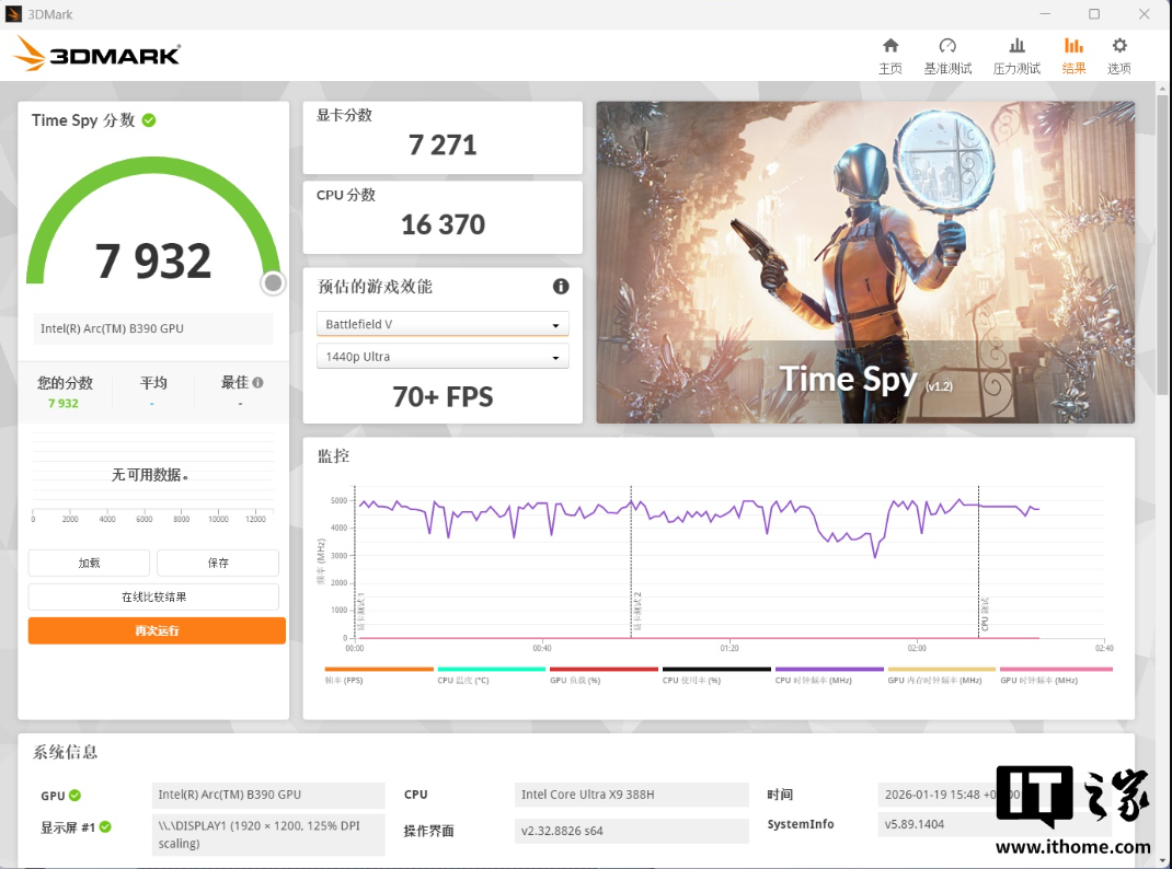 作为对比,联想小新 Pro GT 16 AI 元启版的酷睿 Ultra X9 处理器 388H 的核显在 3D Mark Time Spy 中的得分为 7271 分,综合成绩 7932 分,和锐龙 AI MAX+ 392 相比差距还是有点明显的。
