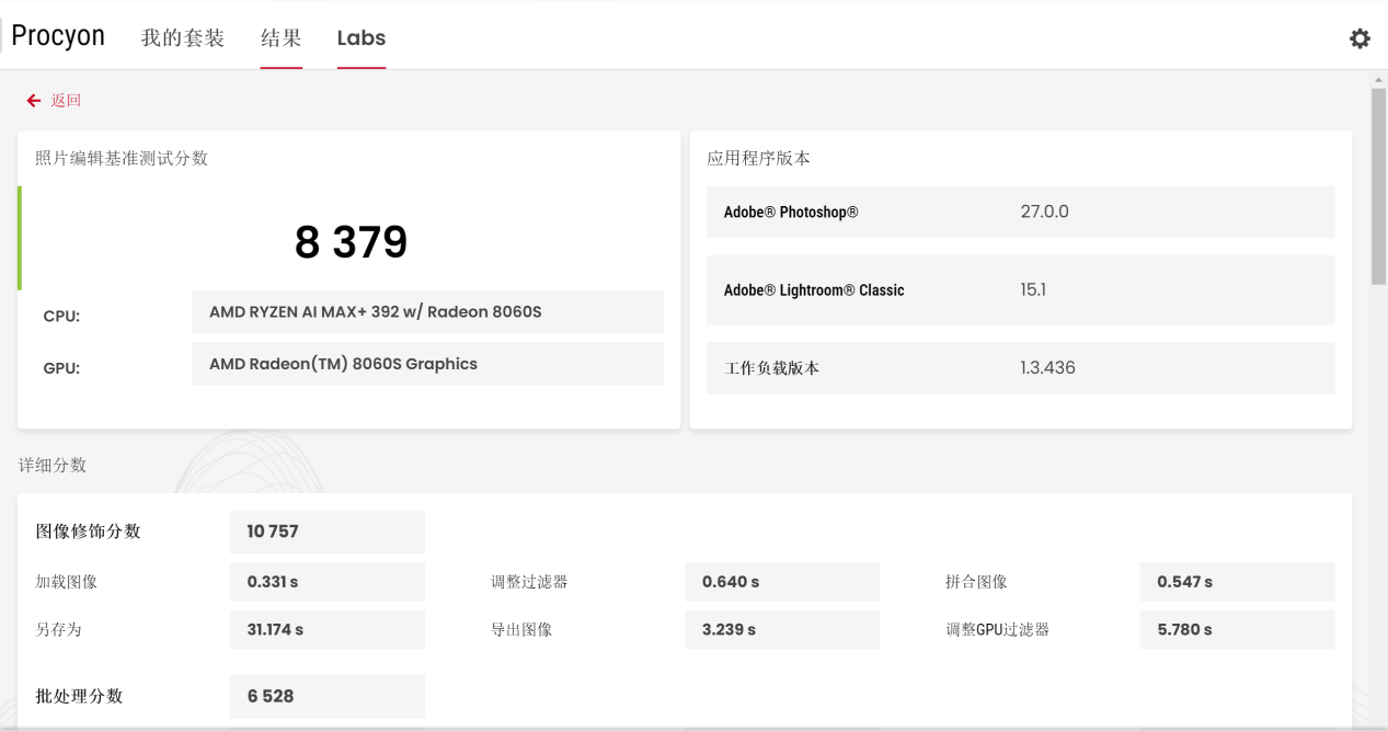 然后我们再看其他生产力方面,使用 UL Procyon 照片编辑基准测试,华硕天选 Air 2026 在这一项目中得到 8379 的高分。