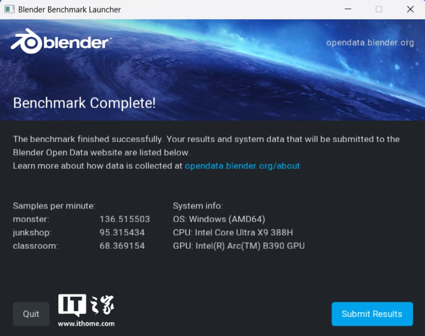 然后是 Blender Benchmark 的测试,锐龙 AI MAX+ 392 处理器的表现如下:
