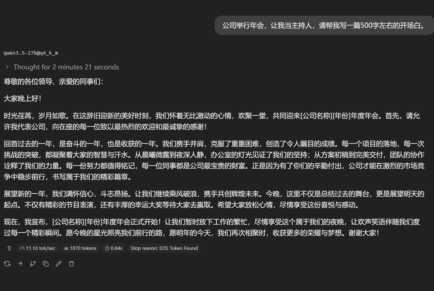 再问公司年会开场白的问题,表现同样是非常出色,思考推理时间 21.15 秒,输出 1560 tokens,速度为 51.21 tok/s