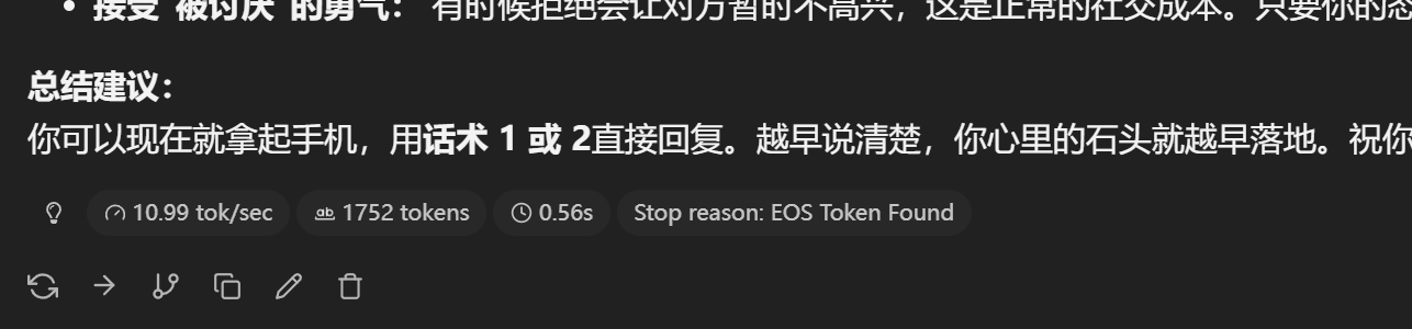 大模型很快给出了得体的回答,本次回答思考推理时间 1 分钟 28 秒,共输出 1752 tokens,输出的速度为 10.99 tok/s,输出时延为 0.56s,整体输出的表现还是能够让人满意的。