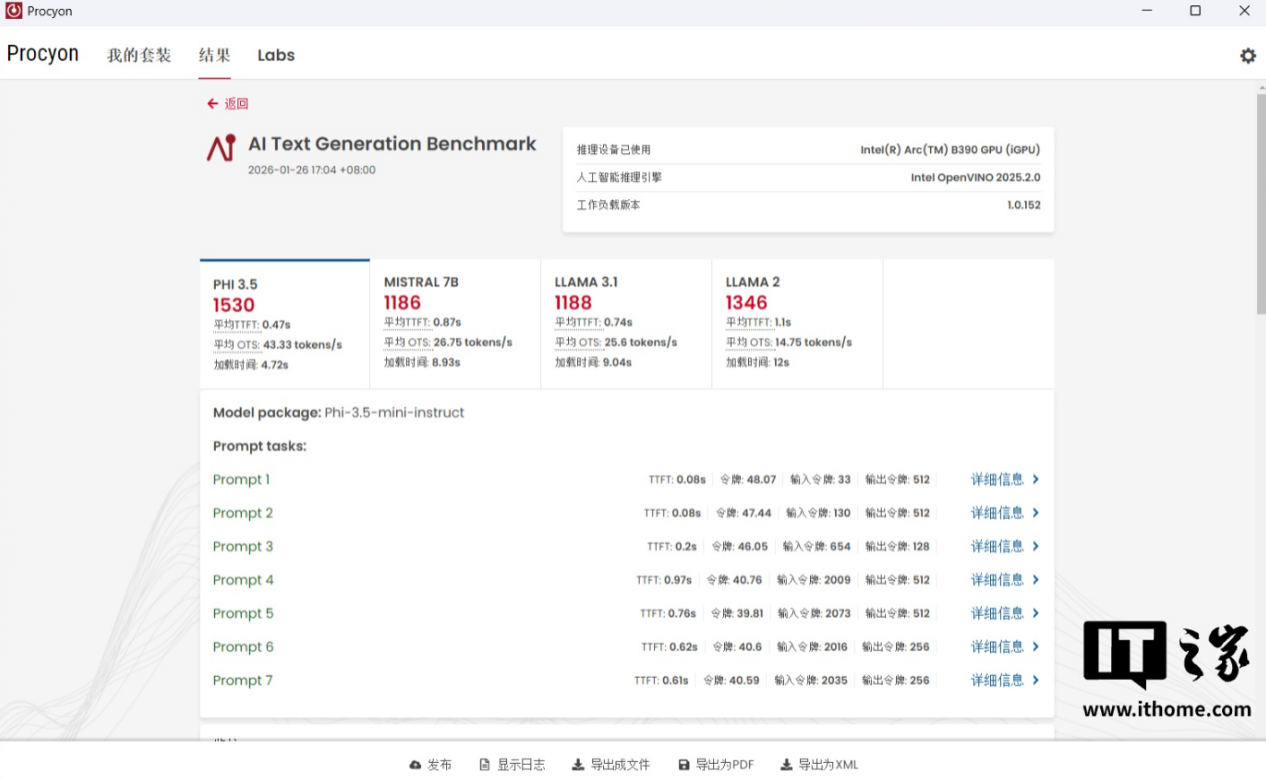 相比之下,酷睿 Ultra X9 处理器 388H 在 UL Procyon AI 文本生成基准测试中,GPU 的 PHI3.5 模型 1530 分;MISTRAL 7B 模型 1186 分;LLAMA 3.1 模型 1188 分;LLAMA 2 模型 1346 分,在该项目中则领先一筹。