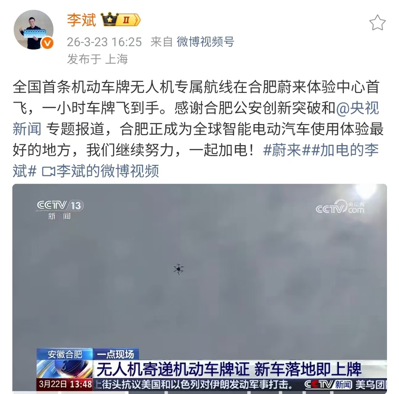 IT之家 3 月 23 日消息,蔚来创始人、董事长、CEO 李斌今日宣布,全国首条机动车牌无人机专属航线在合肥蔚来体验中心首飞,一小时车牌飞到手。