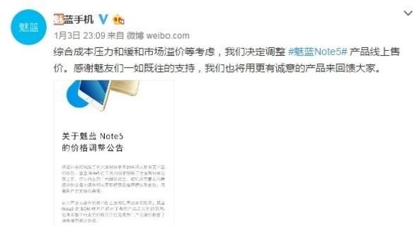 魅族在2017年年初上调魅蓝Note 5售价,当时距离手机发售还不到一个月,小米随后宣布上调红米4/4A系列零售价100元,努比亚miniS也宣布将价格上调100至200元。