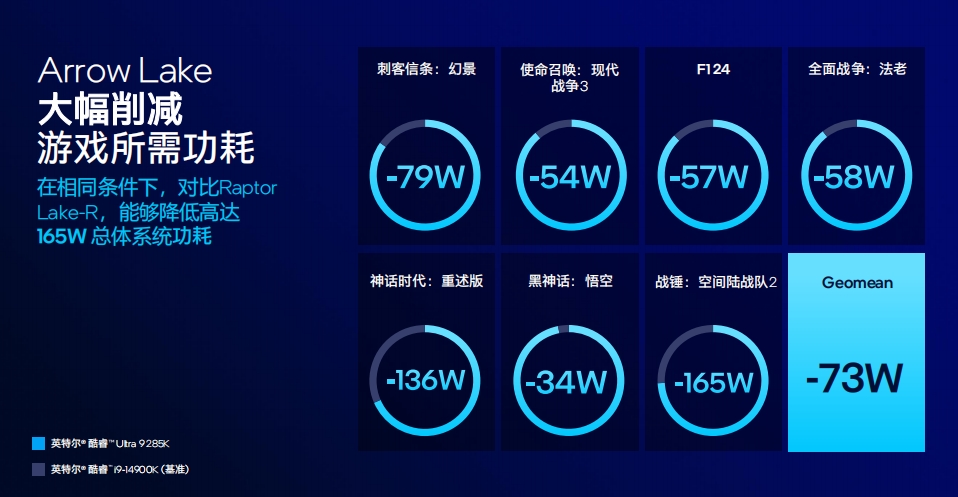根据英特尔的实测数据,Ultra 9 285K可以在系统功耗低80W的情况下,提供与i9-14900K相近的游戏性能,在多项游戏测试中,同等帧数下Ultra 9 285K的平均功耗降低73W,最高降低165W。