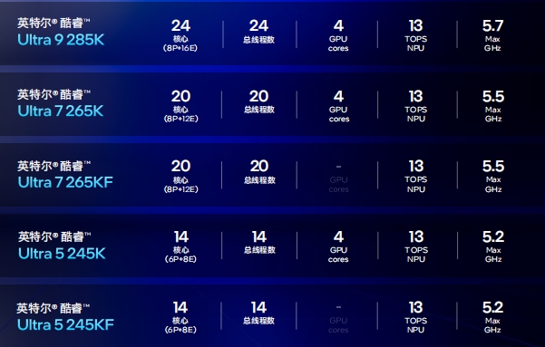 换言之,在Arrow Lake架构中,你或许会看到更多不同的定制型号,不过英特尔官方公开售卖的,目前依然是Ultra 9、Ultra 7和Ultra 5三个系列,已公布的处理器型号规格如下:
