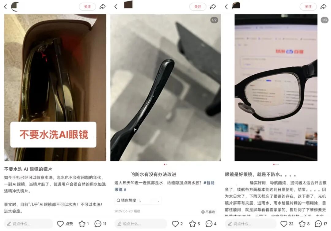 惊蛰研究所还注意到,AI眼镜作为一种集成了多种电子元器件的数码产品,并且默认会在全天候场景使用,但不少产品的防水能力或许并不理想。在小红书上,有用户反馈下雨天使用导致AI眼镜进水损坏,有用户水洗眼镜后发现镜片故障。还有用户担心长期使用时,汗水会从镜腿接缝处渗入导致设备损坏。