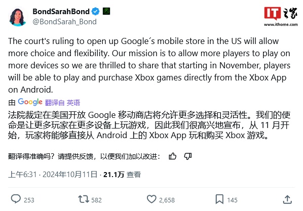 IT之家 10 月 11 日消息,微软 Xbox 部门总裁萨拉・邦德(Sarah Bond)今天(10 月 11 日)在 X 平台发布推文,宣布将于 11 月开始,安卓版 Xbox 应用可以直接畅玩和购买 Xbox 游戏。