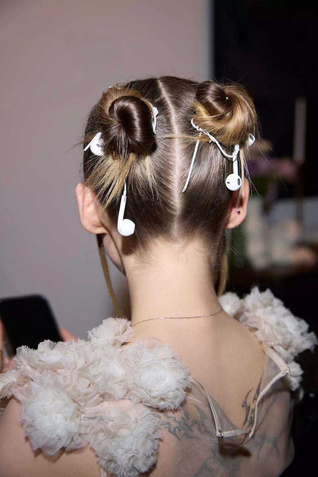 不仅仅是这些明星的街拍带起这股风潮,连时尚杂志也在背后推了一把。2025 年纽约时装周上,Dove Cameron 甚至把苹果 Earpods直接缠进发髻,时尚杂志《Vogue》把这个造型当成有线耳机复兴的典型案例进行传播。一时间,几乎全球的造型艺术家都关注到了“有线耳机可以被拿来做造型”这件事。