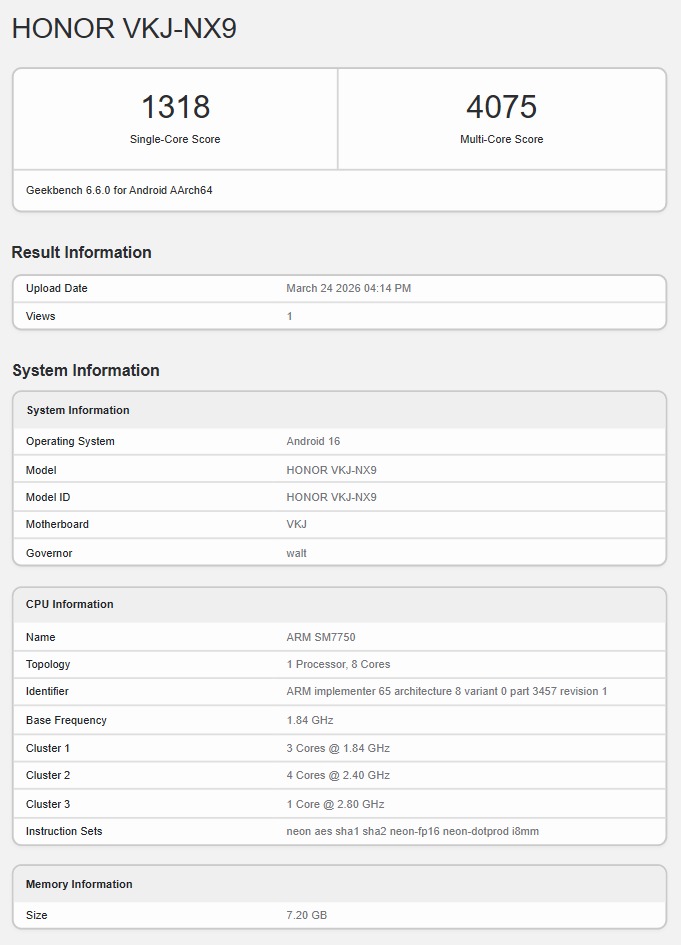 GeekBench 跑分页面虽然未直接标明芯片名称,不过 CPU 型号“SM7750”指向了高通骁龙 7 Gen 4 处理器(搭配 Adreno 722 GPU),此外页面信息显示该机至少会推出 8GB 配置组合。