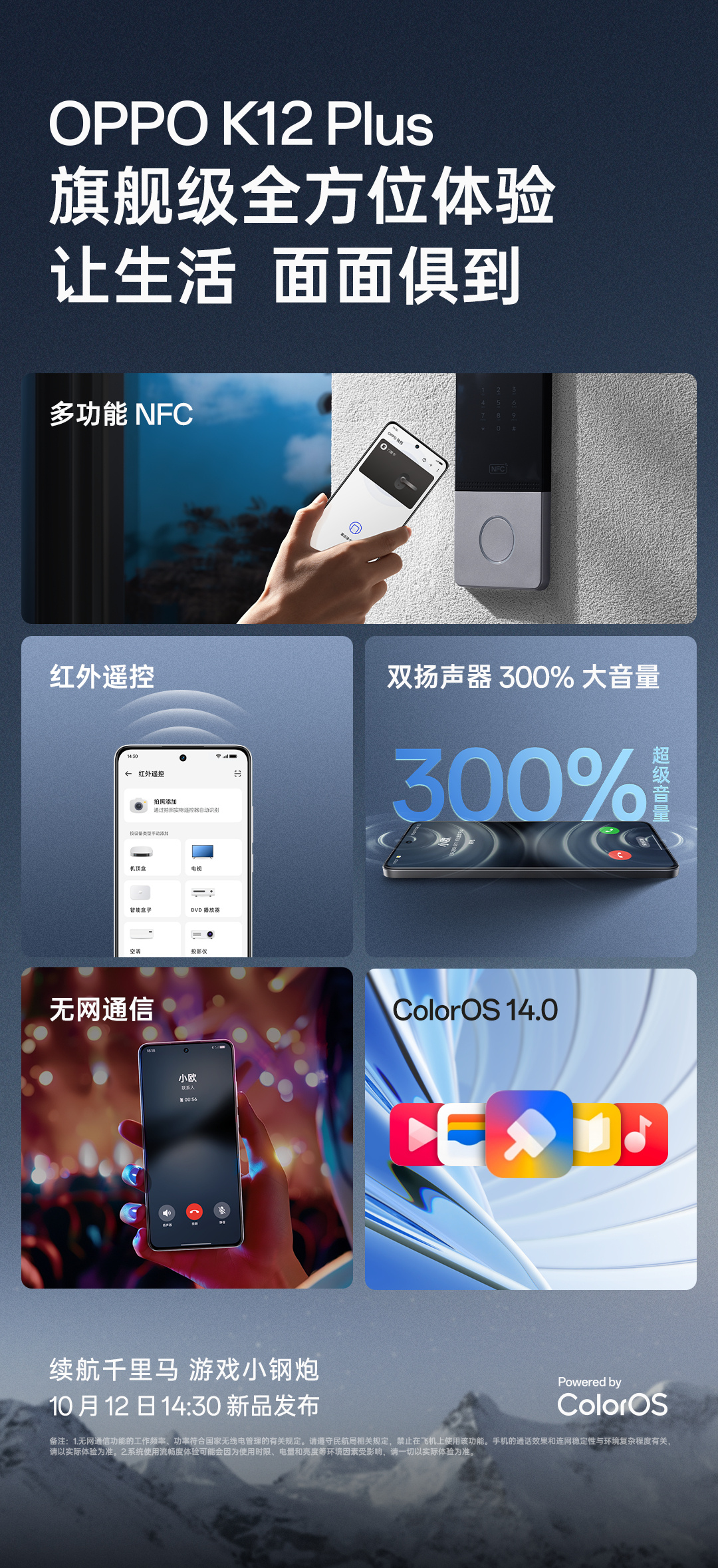 据介绍,OPPO K12 Plus 配备立体声双扬声器,300% 超大音量,支持无网通信、红外遥控、多功能 NFC 等,搭载 ColorOS 14.0 系统。此外,这款新机还支持 AI 通话摘要、AI 消除,智能识别通话内容,生成重点信息摘要。