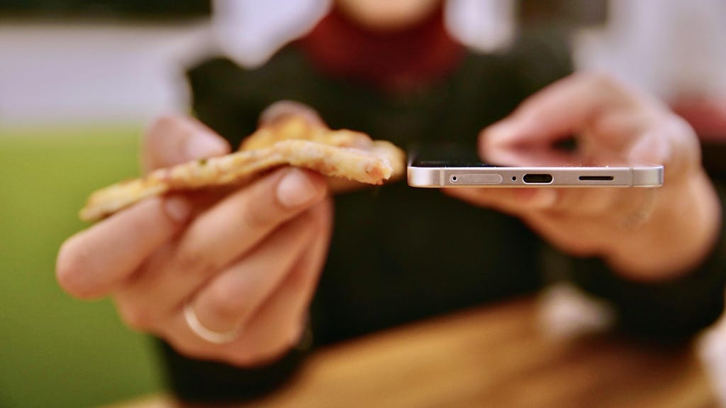 Galaxy S25 Edge(右)与薄底披萨(左)的对比。Jesse Orrall/CNET