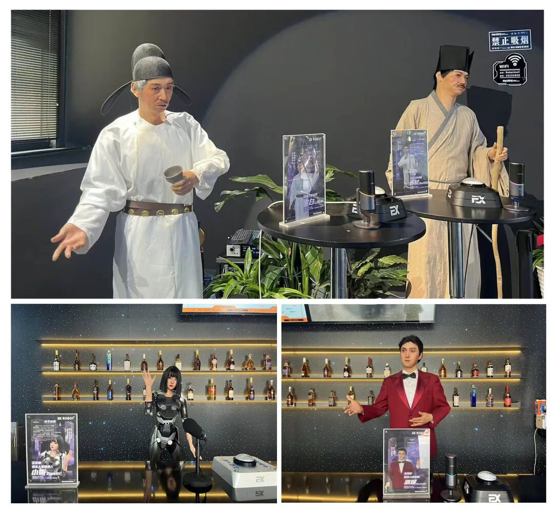 这里有迎宾接待的机器人酒保“希尔”、精通七国语言的机器人“小柒”、表演诗歌脱口秀的机器人“李白”和“苏轼”、精通物理理论的机器人“牛顿”、负责演奏和跳舞的机器人乐队、还有满地蹦跶来找你蹭蹭的机器狗、机器恐龙等,连送餐、取擦手纸、垃圾桶,也都是机器人。