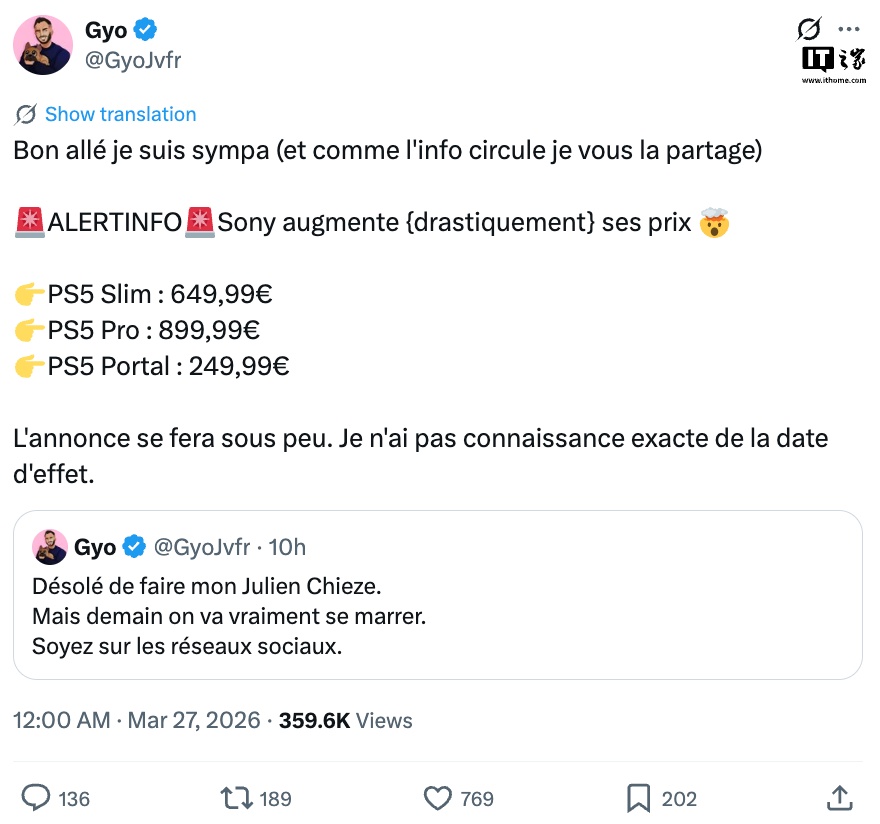 IT之家 3 月 27 日消息,消息源 Gyo 透露,因业界内存涨价潮,索尼旗下 PS5 Slim 和 PS5 Pro 机型将在欧洲平台涨价 100 欧元。