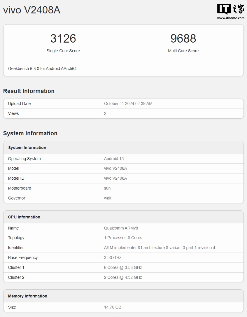 这款机型预装基于安卓 15 的 OriginOS 5 系统,配备 16G 内存,IT之家看到这一跑分记录达到了单核 3126 分,多核 9688 分,而博主 @肥威 今天还放出了一个多核 9706 分的跑分记录。