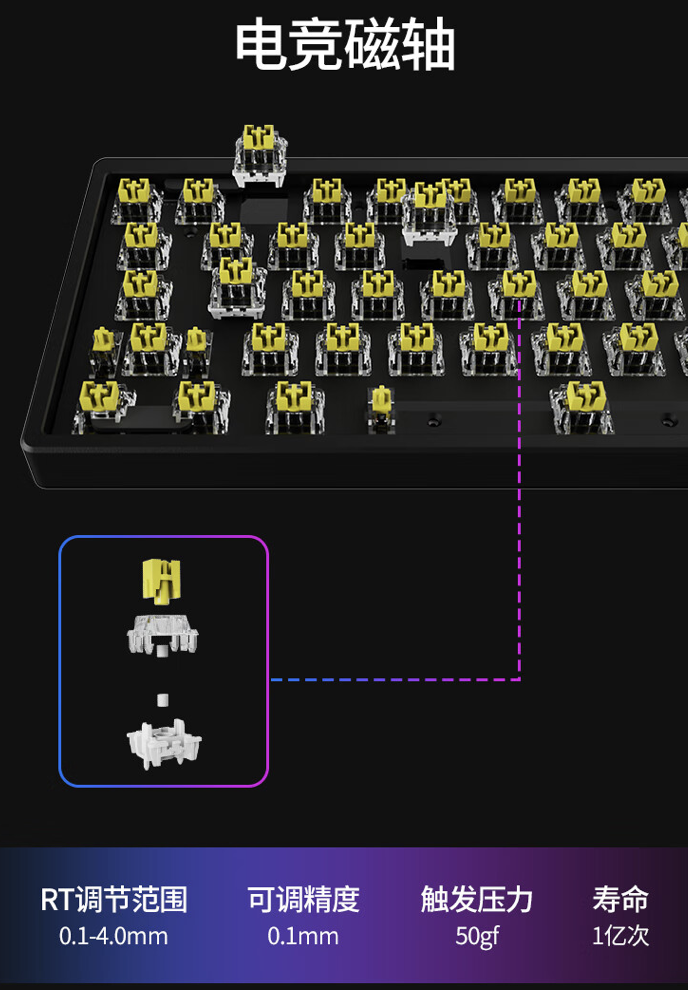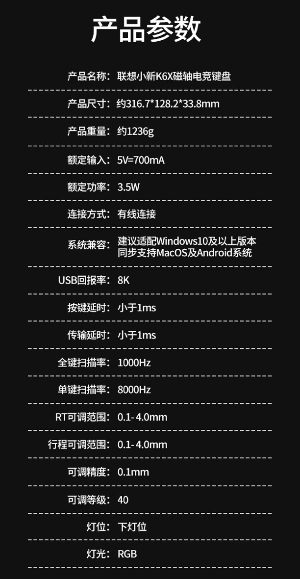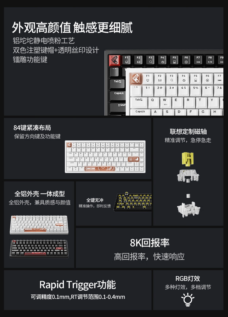 该键盘拥有 8KHz 回报率,使用联想定制磁轴,内置 Rapid Trigger 快速促发功能,采用双色注塑键帽(文字为透明丝印)。