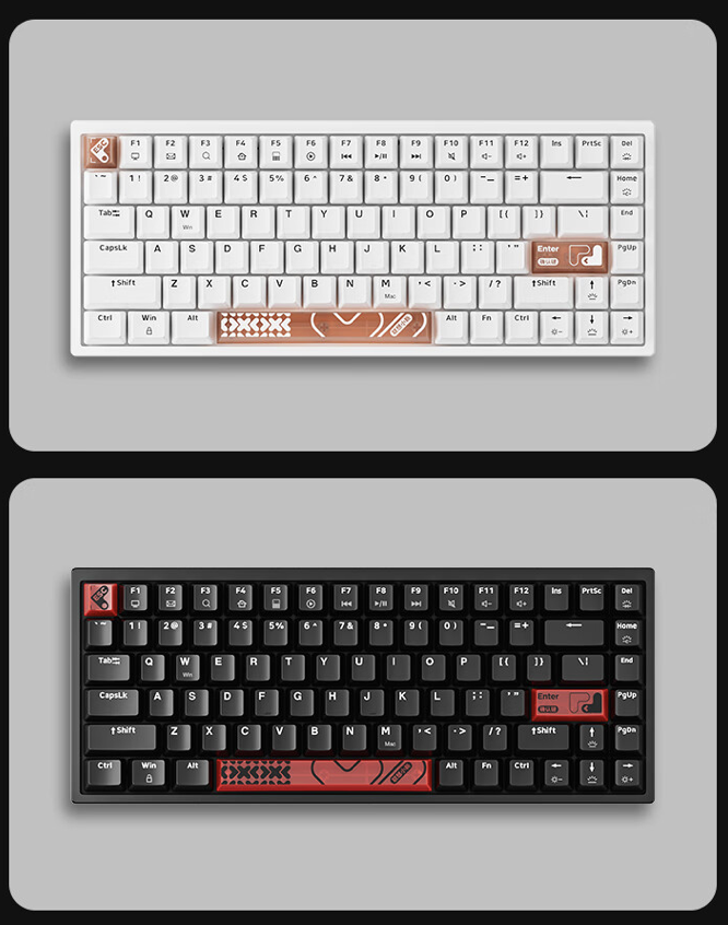 据介绍,这款机械键盘可选黑白双色,其采用全铝合金外壳,使用 84 键配列,拥有 RGB 背光灯效。