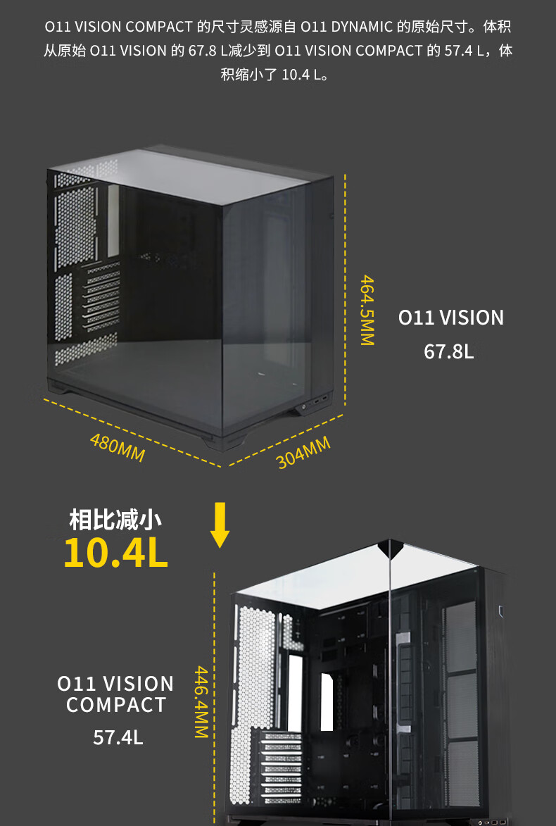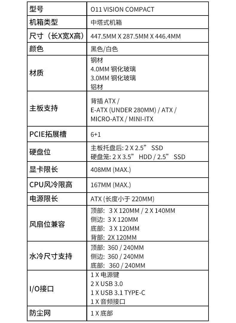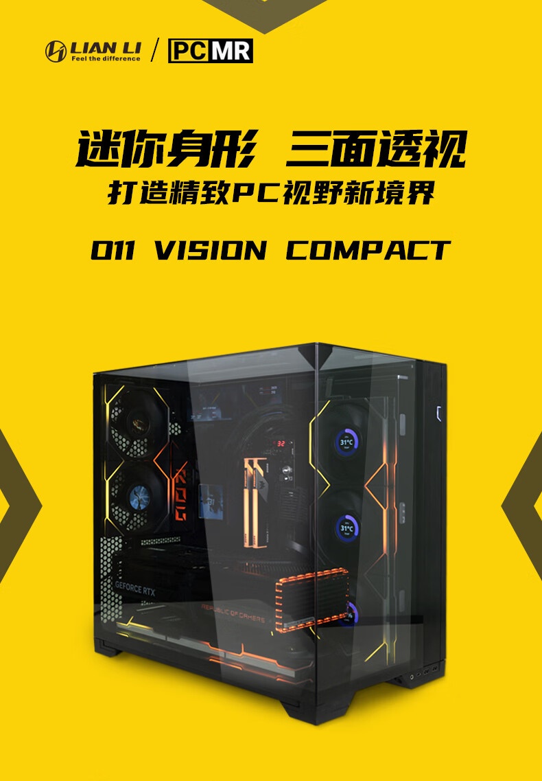 O11 Vision Compact 是联力与 PCMASTER RACE (PCMR) 合作的一款产品,采用三面钢化玻璃无立柱设计,相比原版更加“精缩”,支持更换网孔顶板,支持背插 ATX 主板、可拆卸显卡支架,支持水冷管线隐藏。