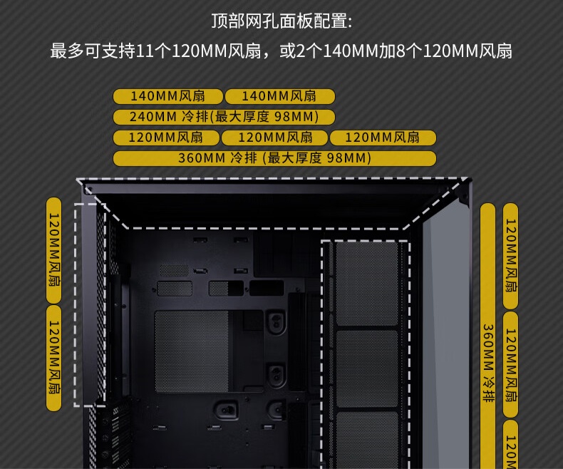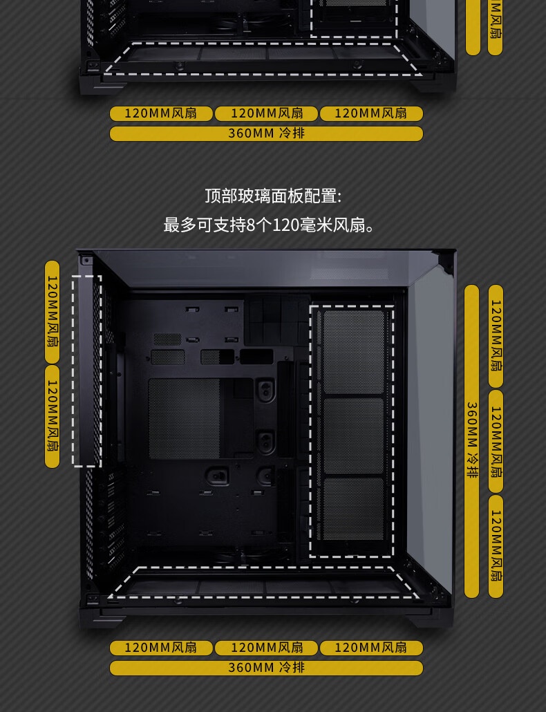 这款机箱支持多达 8 个风扇、1 个冷排,主板托盘上方预留 IPS 显示屏安装位,内置可拆卸显卡支架,适配 278-408mm 显卡。
