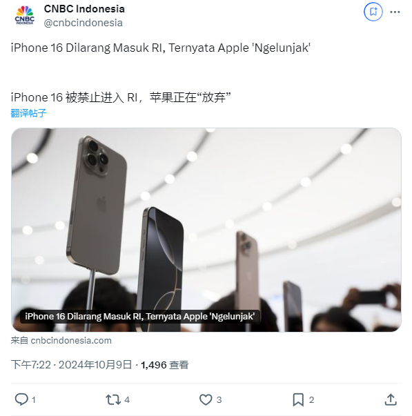 IT之家 10 月 11 日消息,苹果 iPhone 16 系列机型发布近一个月,但至今仍未登陆印度尼西亚市场。印尼工业部长 Agus Gumiwang 表示,主要是因为 iPhone 16 尚未通过 TKDN 认证。