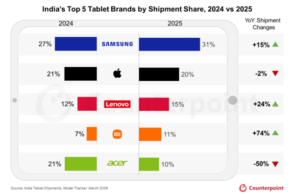 【CNMO科技消息】持续占据全球平板电脑市场头把交椅的苹果,在印度市场却面临着截然不同的局面。据CNMO了解,在这个世界人口最多的国家,三星已在平板电脑领域保持领先地位相当长一段时间。根据Counterpoint Research发布的2025年印度平板电脑市场分析报告,这家韩国科技巨头在2025年继续主导了市场。