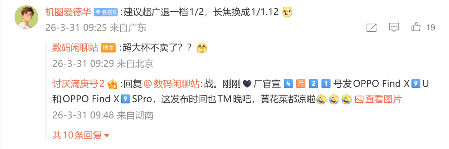 后续有用户在评论区表示:“建议超广退一档 1/2,长焦换成 1/1.12”,博主回复道:“超大杯不卖了??”;另一名用户则表示:“电池得大啊”,博主则回复道:“我猜会做到 8 开头”。