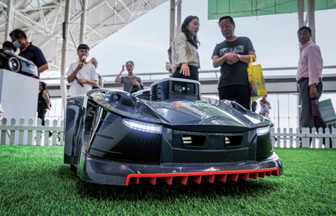 2025年4月19日,2025年“外贸优品中华行江苏站”展览上的智能割草机器人图/新华