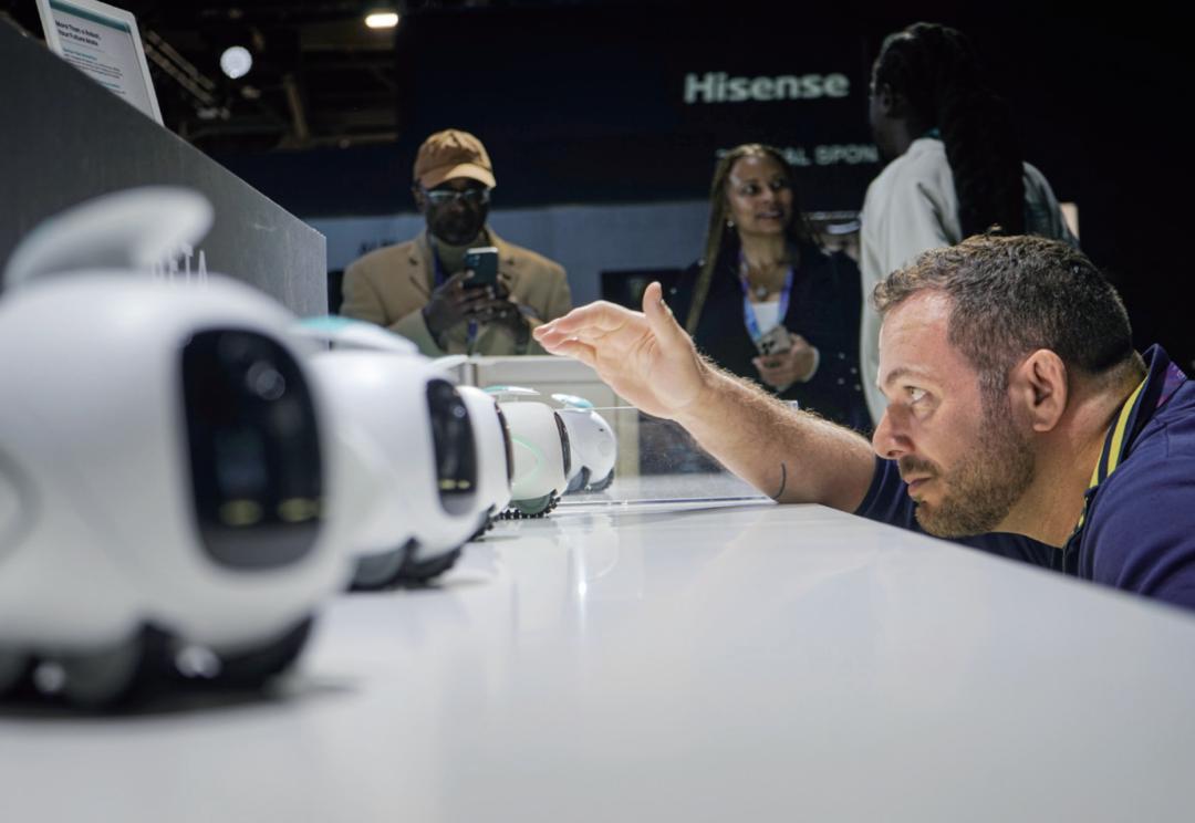 2026年1月7日,观众在2026年美国拉斯维加斯消费电子展期间观看搭载新一代AI智能识别引擎的陪伴机器人。图/新华
