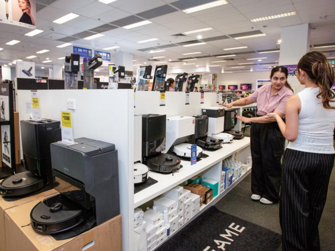 2025年10月13日,在澳大利亚悉尼市中心一家电器商场内,店员向顾客介绍中国品牌扫地机器人图/新华